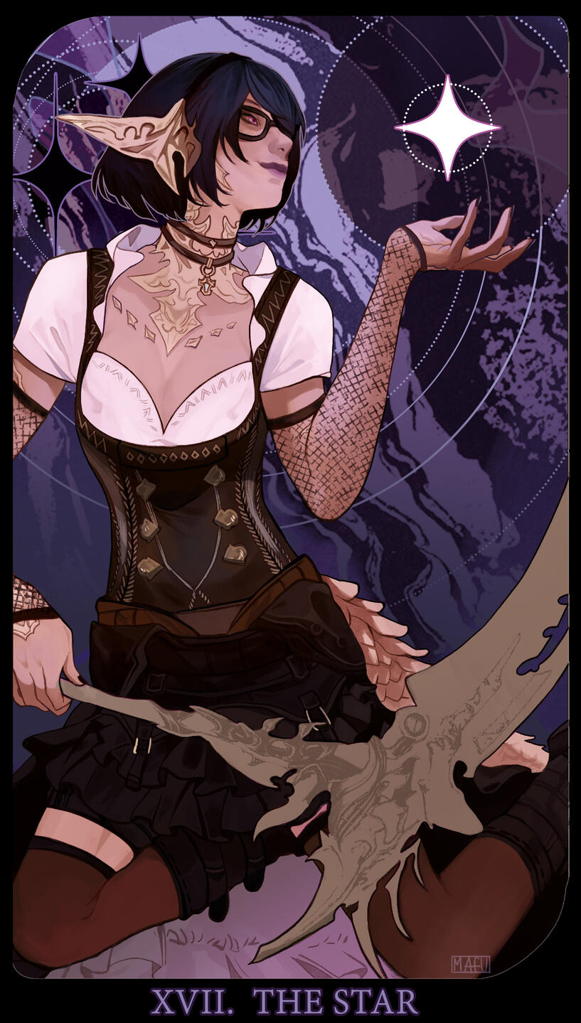 » the seventh daughter of a seventh daugher, ran was once next in line to lead the (in)famous Rokuyari family of fortune tellers and soothsayers. however, her independance outgrew their boundaries and superstitions, and she forcibly disconnected herself from them by changing her surname to suit her new life. now free of their control, she endeavors to make a new life for herself in eorzea as an adventurer, healer, and fortune teller for hire.» even though the term 'goth' doesn't exist in eorzea, ran would be its poster child if it did. she loves dark fashion, dramatic makeup, and all sorts of odd, spooky interests that might be off-putting to those not used to such things. despite all this, ran's personality is rather bright and cheerful, even if she is prone to 'dark dramatics'. she doesn't seem to realize that not everybody is interested in collecting skulls or reading up on voidsent.» ran specializes in the forms of fortune telling that her family is well known for- star charts, horoscopes and tarot cards. though she doesn't consider it her divine calling, she still loves divination dearly, and will gladly offer readings to random citizens in exchange for gil to help pay her rent.» rorei, her faithful weasel companion, seems a bit too intelligent for his own good- fond of playing pranks on unsuspecting folk or stealing food right from the hands of passerby. maybe there's more to him than meets the eye... does it have anything to do with ran's skill with scythedancing?